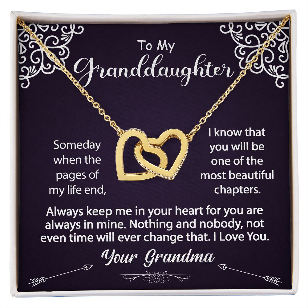 Two hearts embellished with Cubic Zirconia stones, interlocked together as a symbol of never-ending love between a granddaughter and granddaughter.