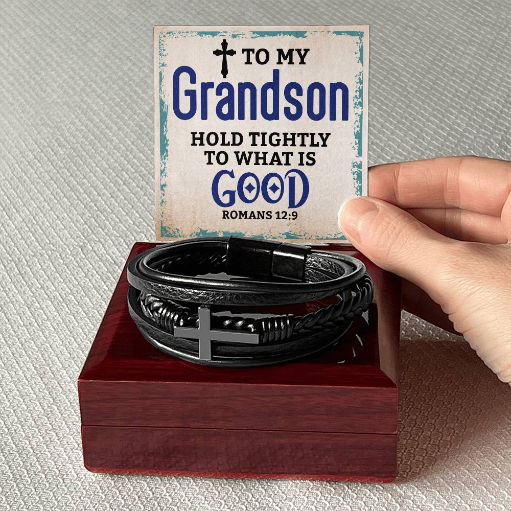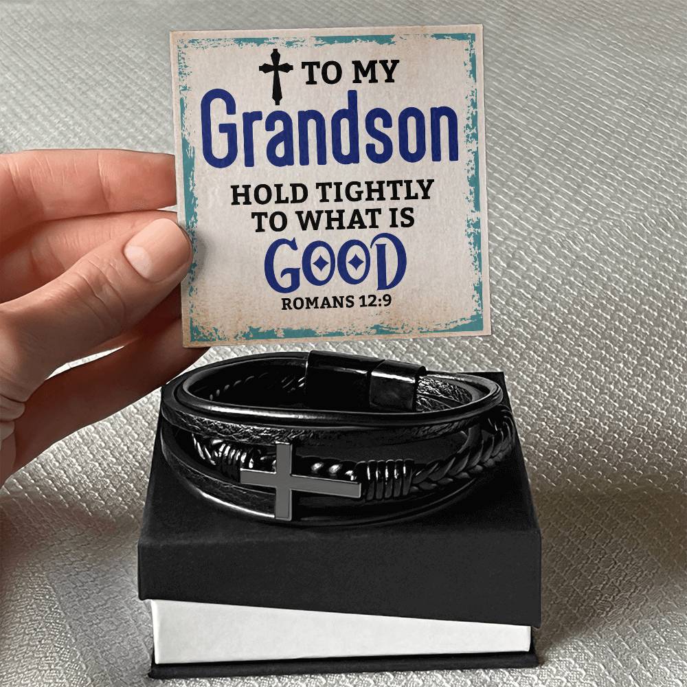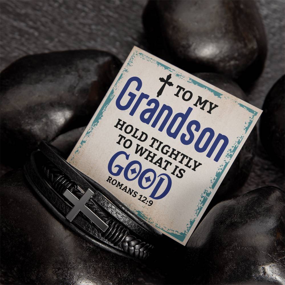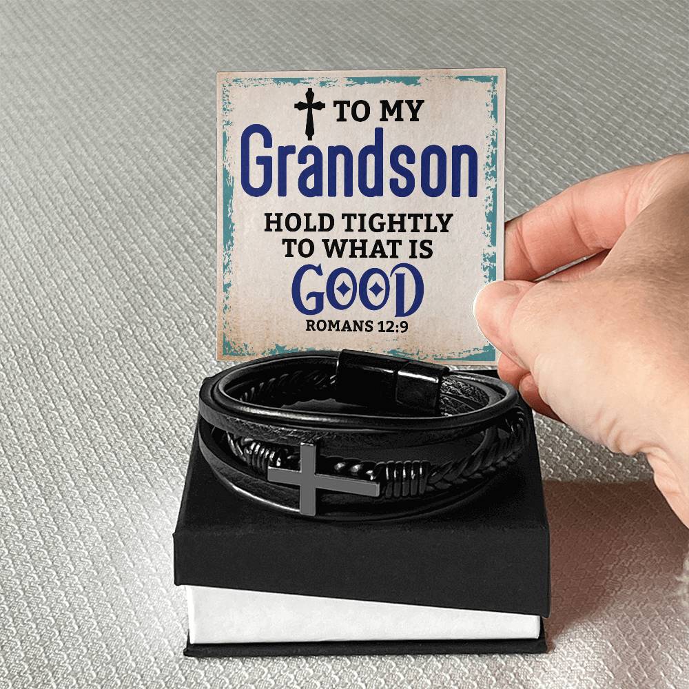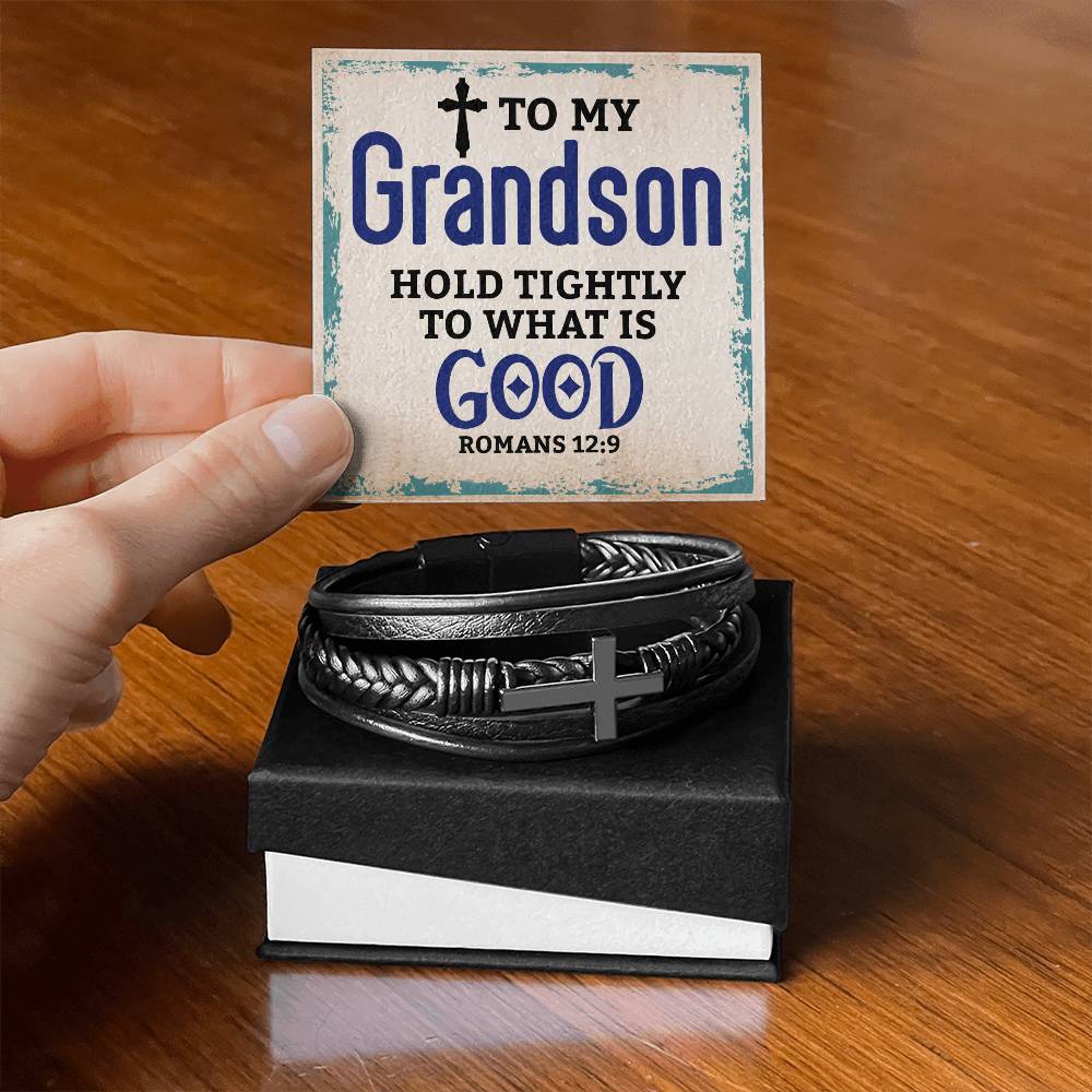 Best Gifts for Grandson: Personalized Mens Cross Leather Bracelet Gift For Grandson On Birthday, Graduation, Christmas Present Keepsakes Message Card Custom Jewelry For Him