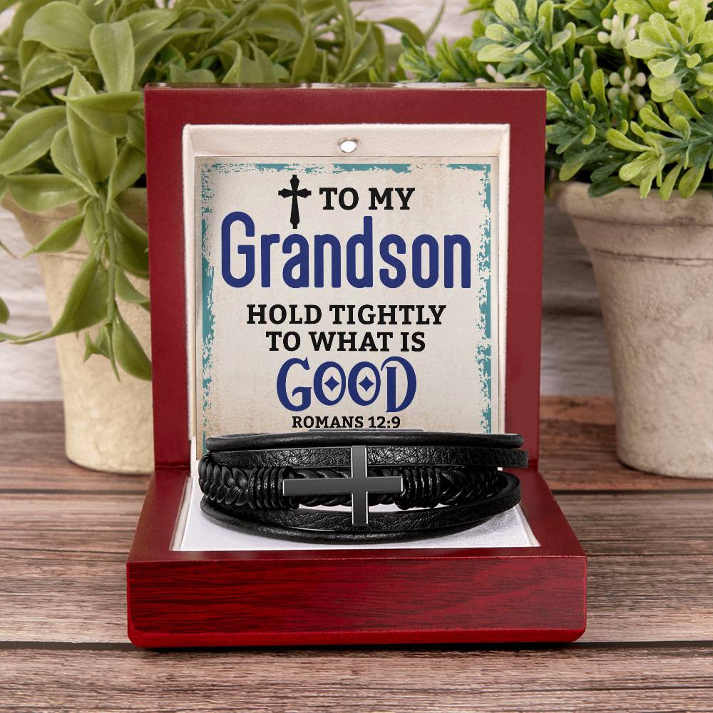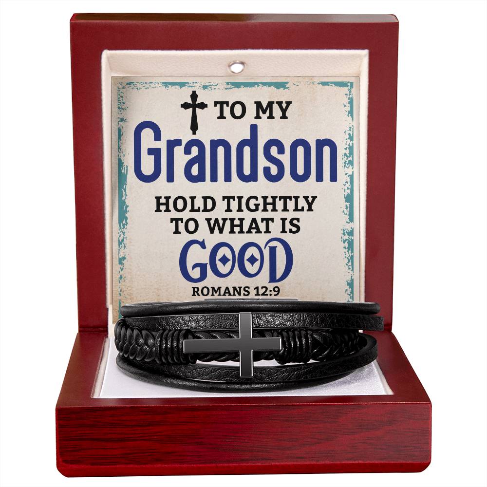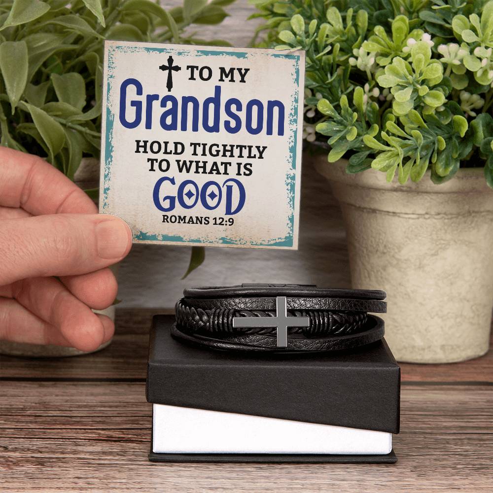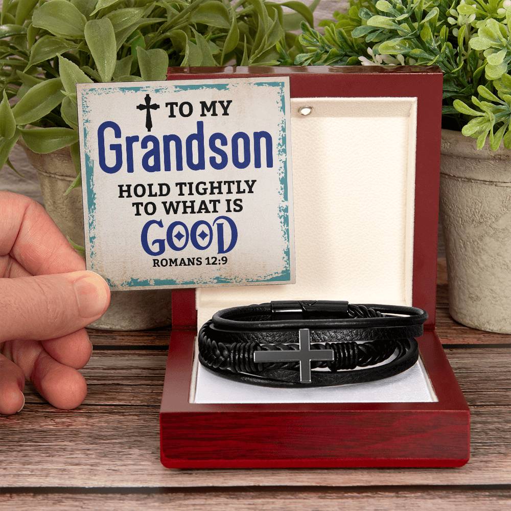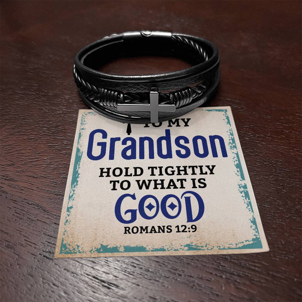 Best Gifts for Grandson: Personalized Mens Cross Leather Bracelet Gift For Grandson On Birthday, Graduation, Christmas Present Keepsakes Message Card Custom Jewelry For Him