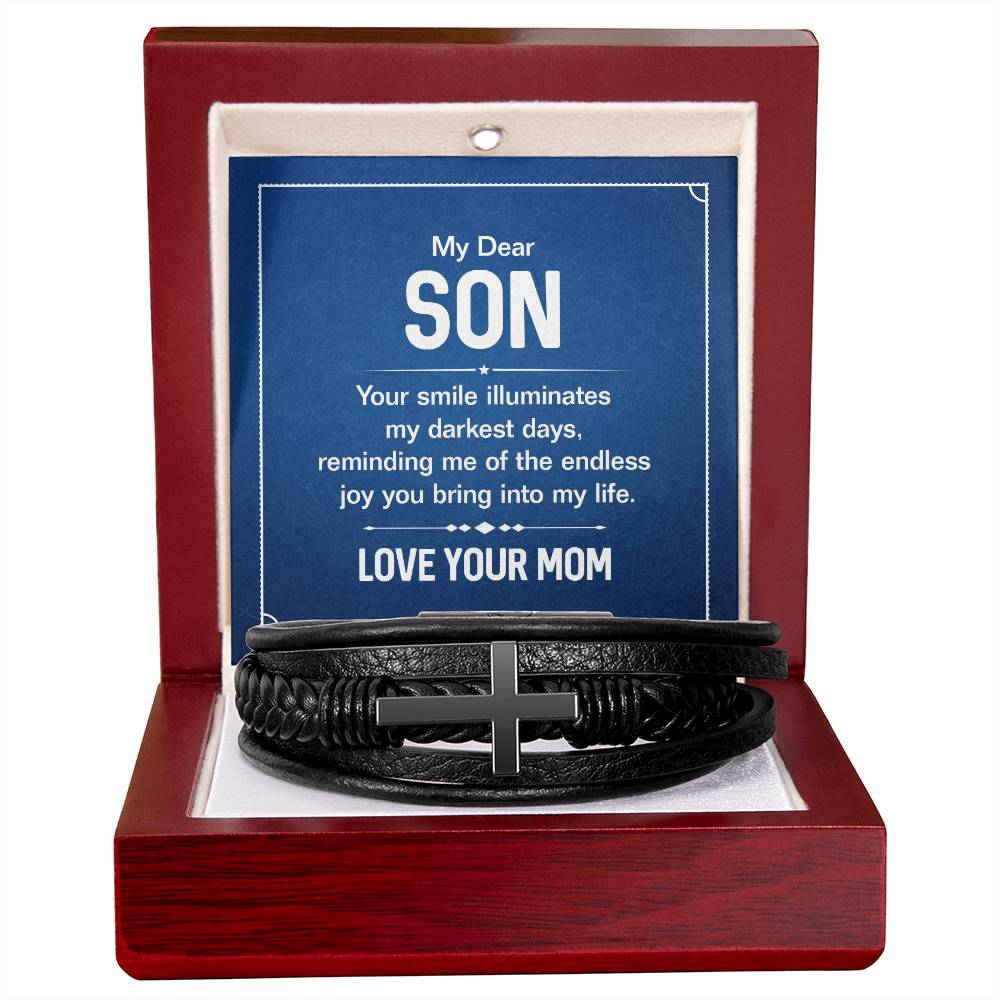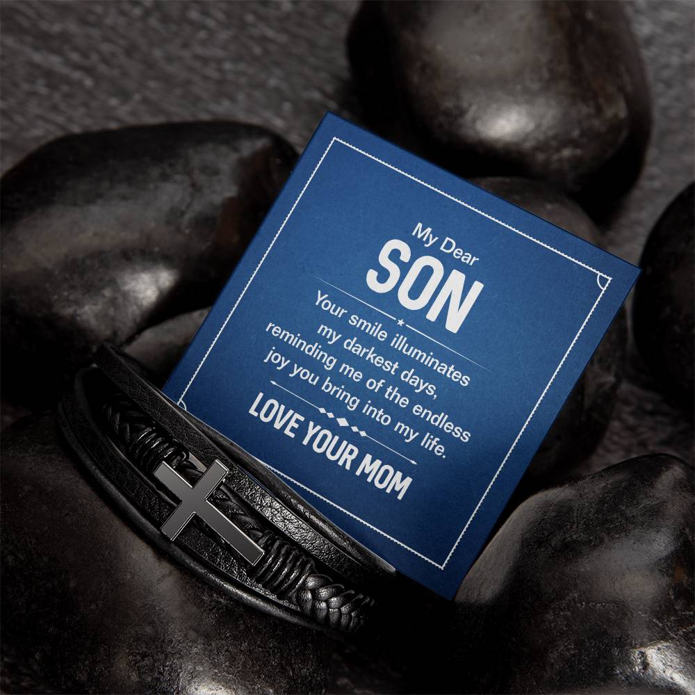 Best Gifts for Son: Personalized Mens Cross Leather Bracelet Gift For Son On Birthday, Graduation, Christmas Present Keepsakes Message Card Jewelry For Him