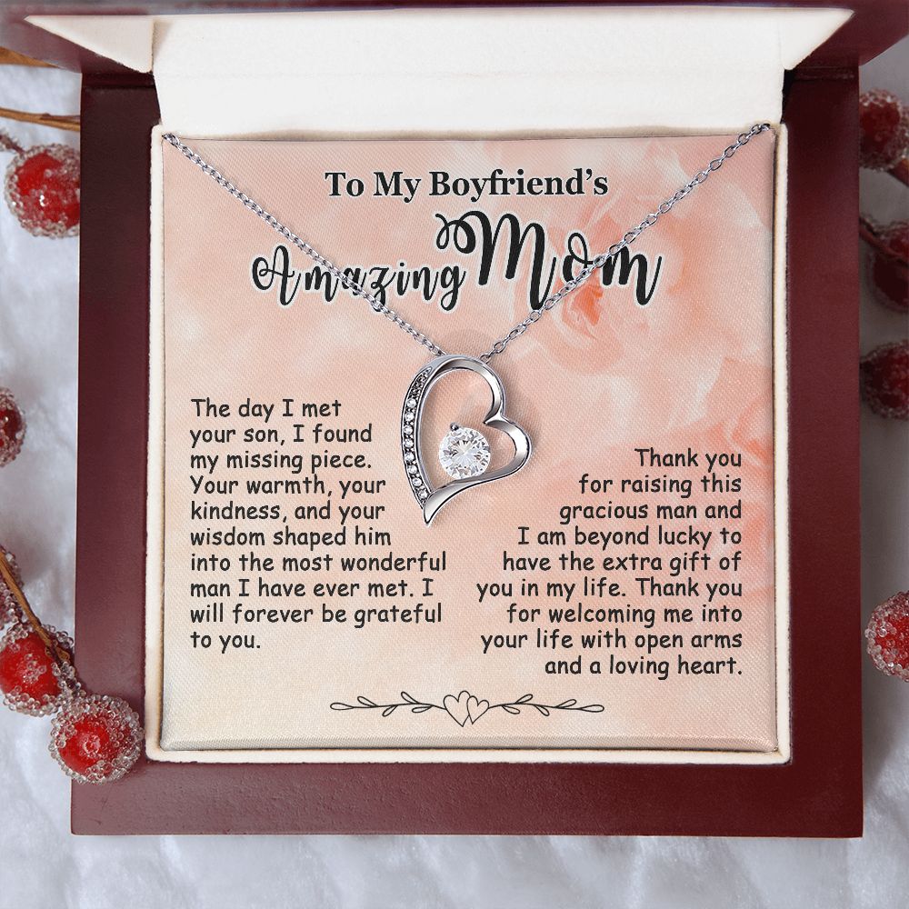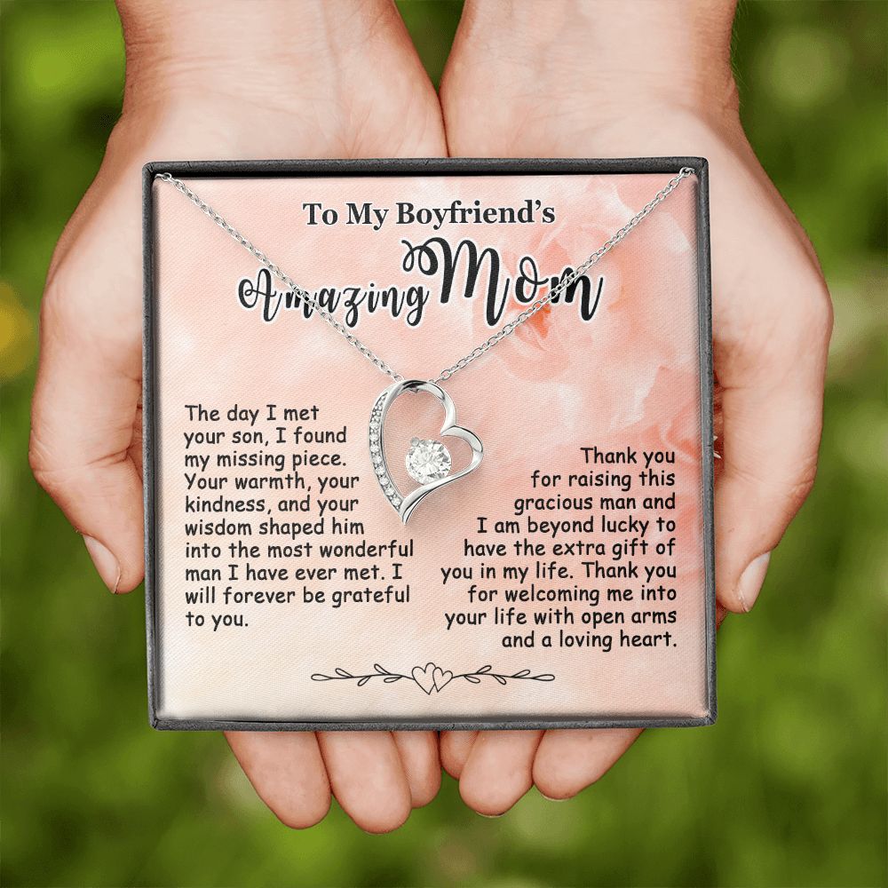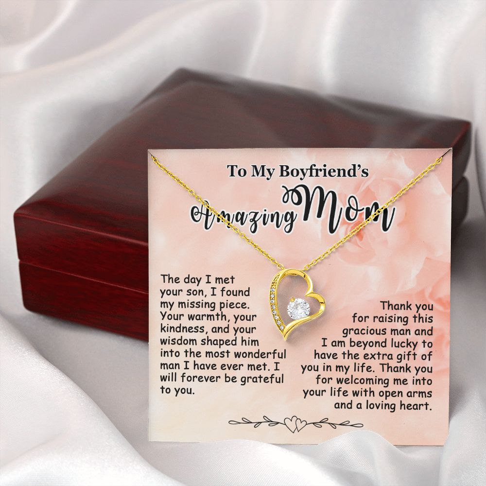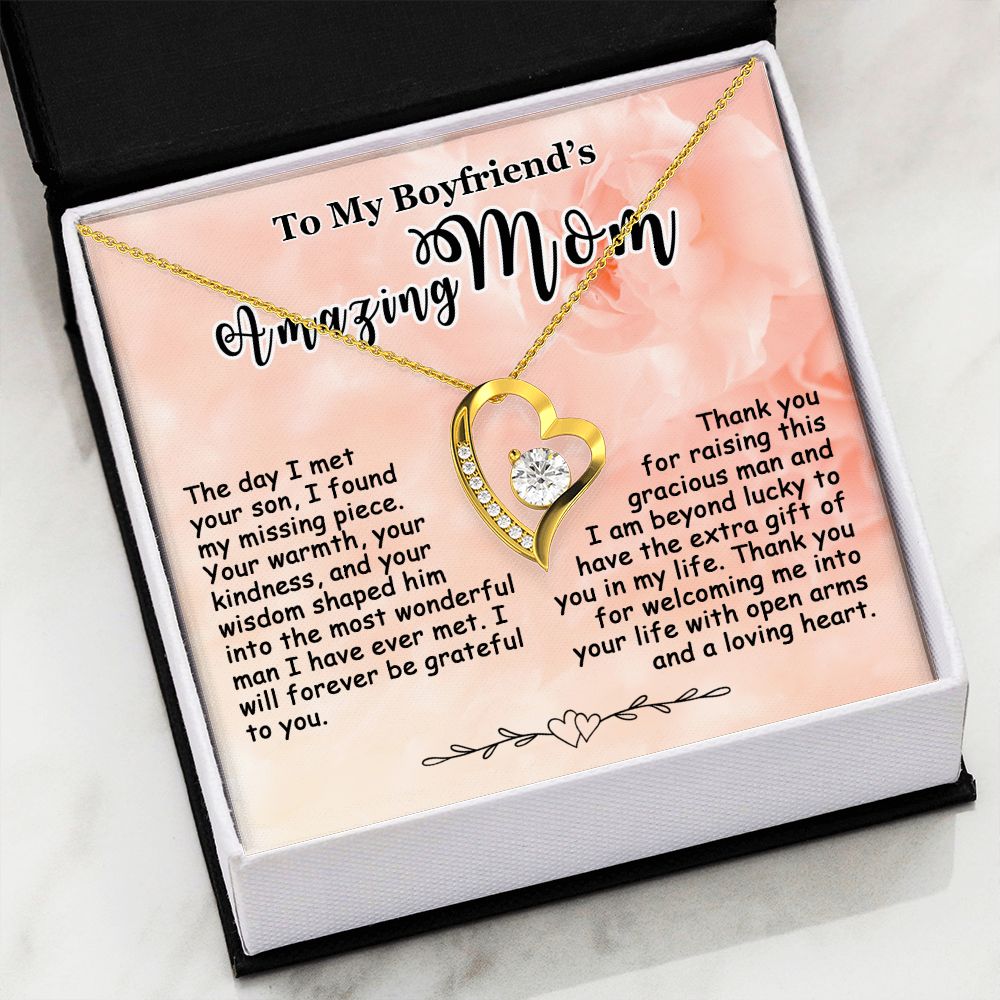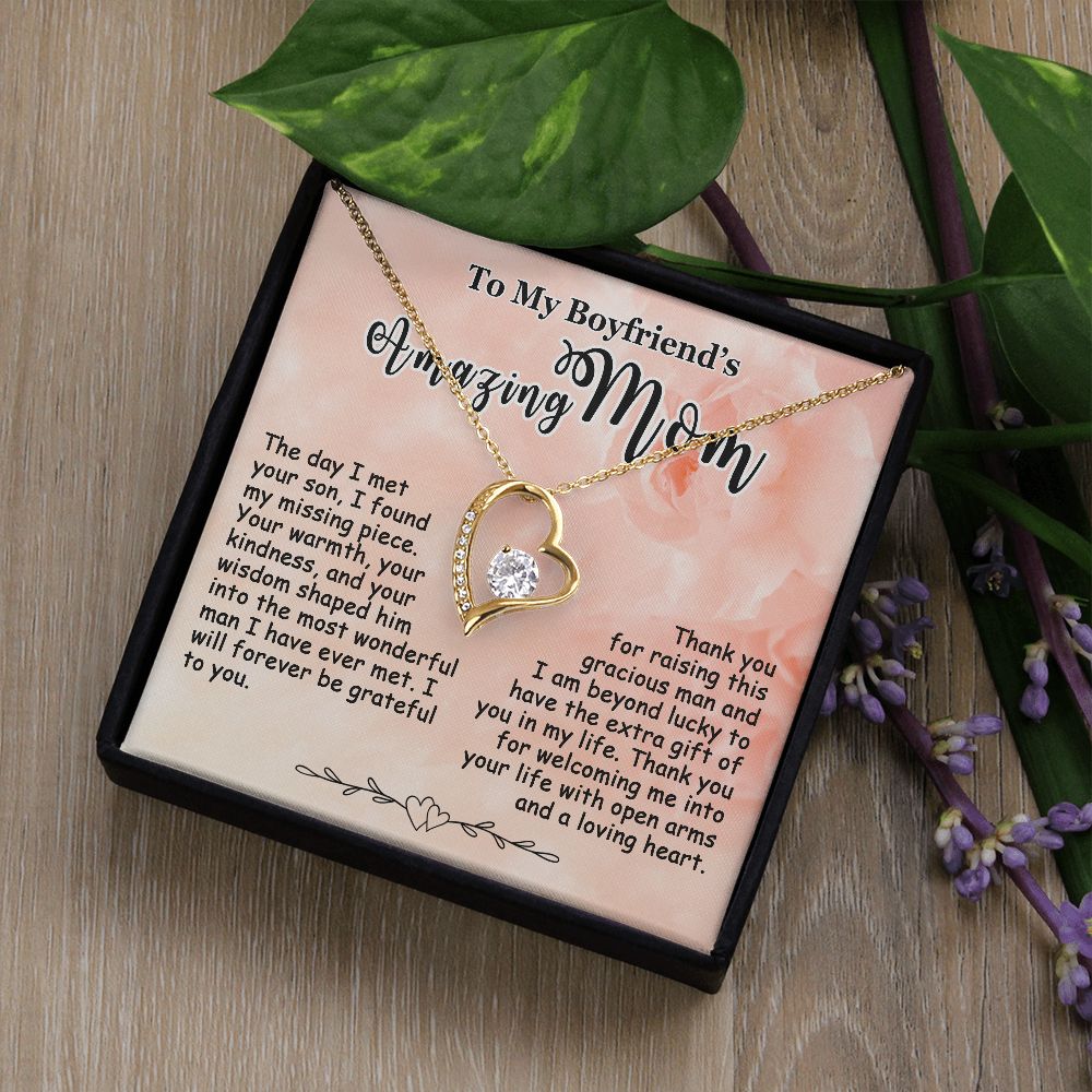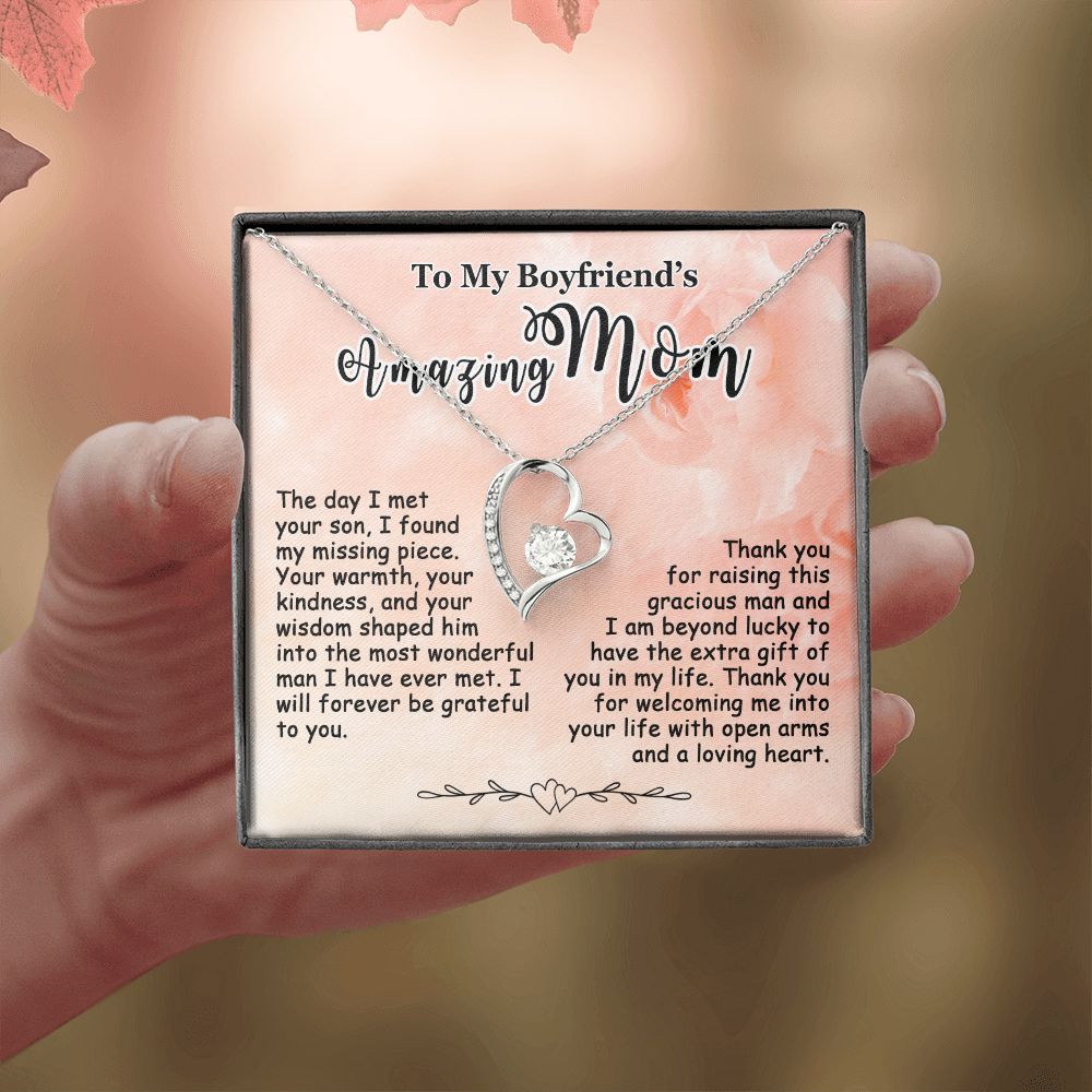 Showing your appreciation to your boyfriend’s mom just got easier. Our To My Boyfriend’s Mom Necklace makes an ideal Mother’s Day or birthday present. Thoughtfully crafted and paired with a meaningful message card, this necklace will become a treasured memento close to her heart. Show your love to your boyfriend’s mom today.