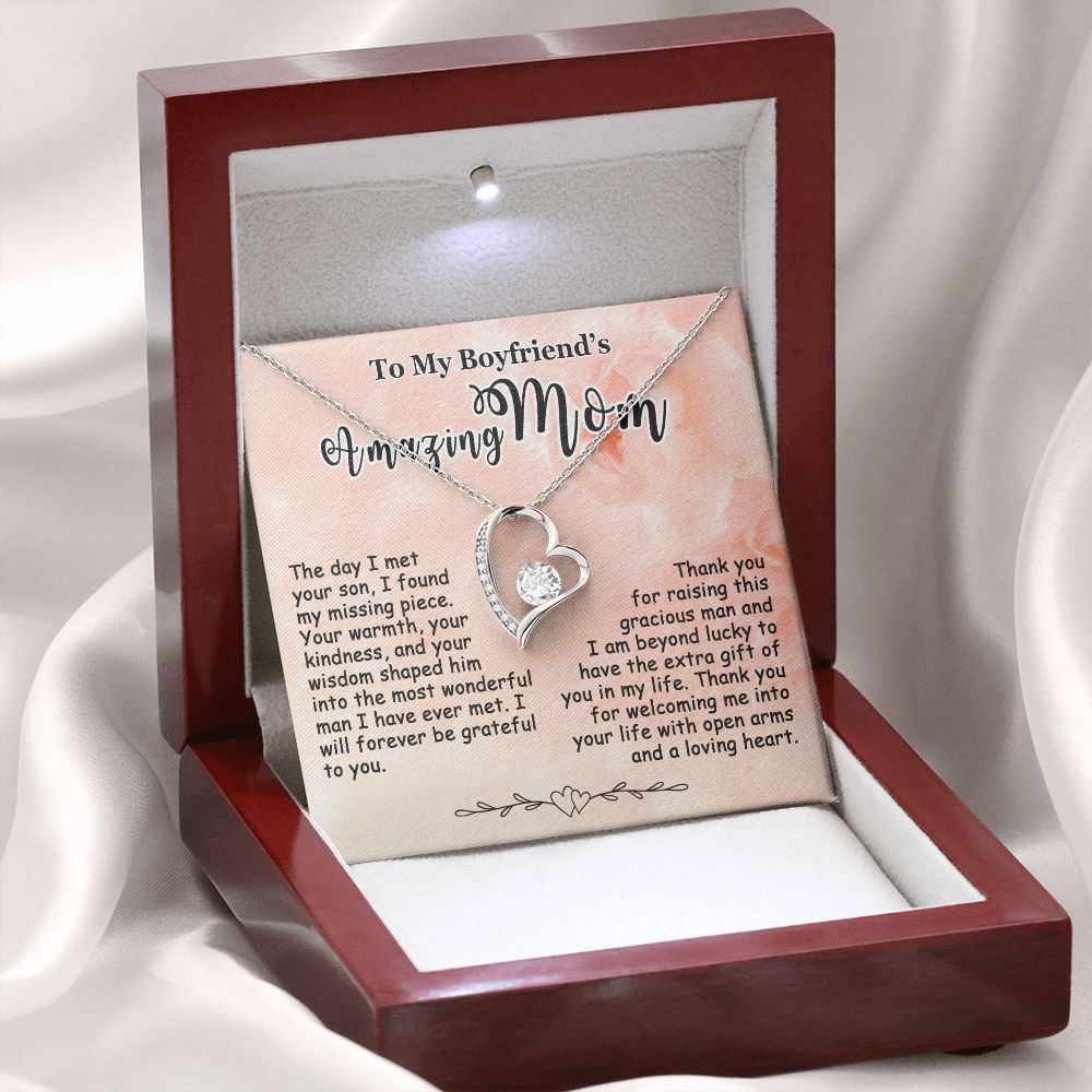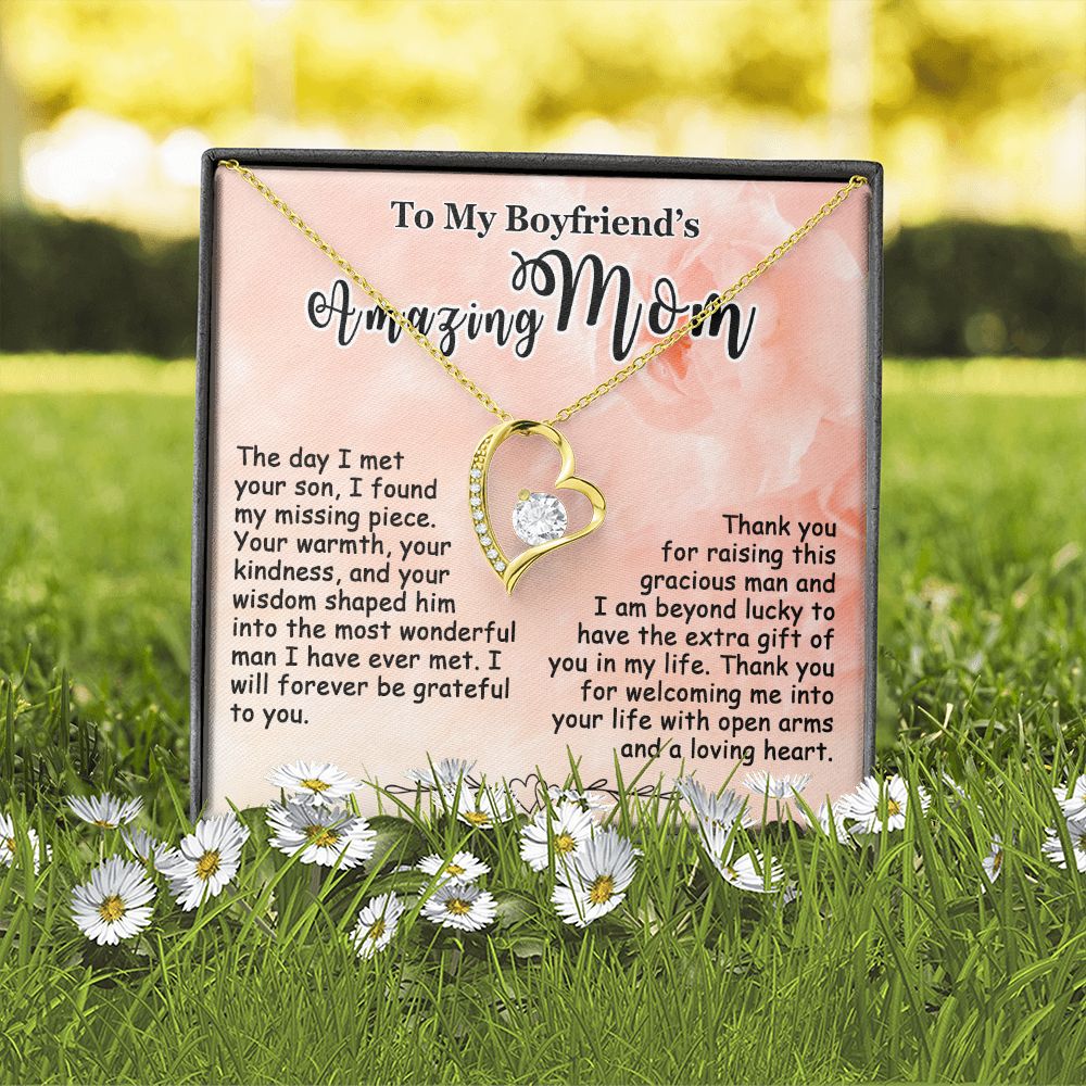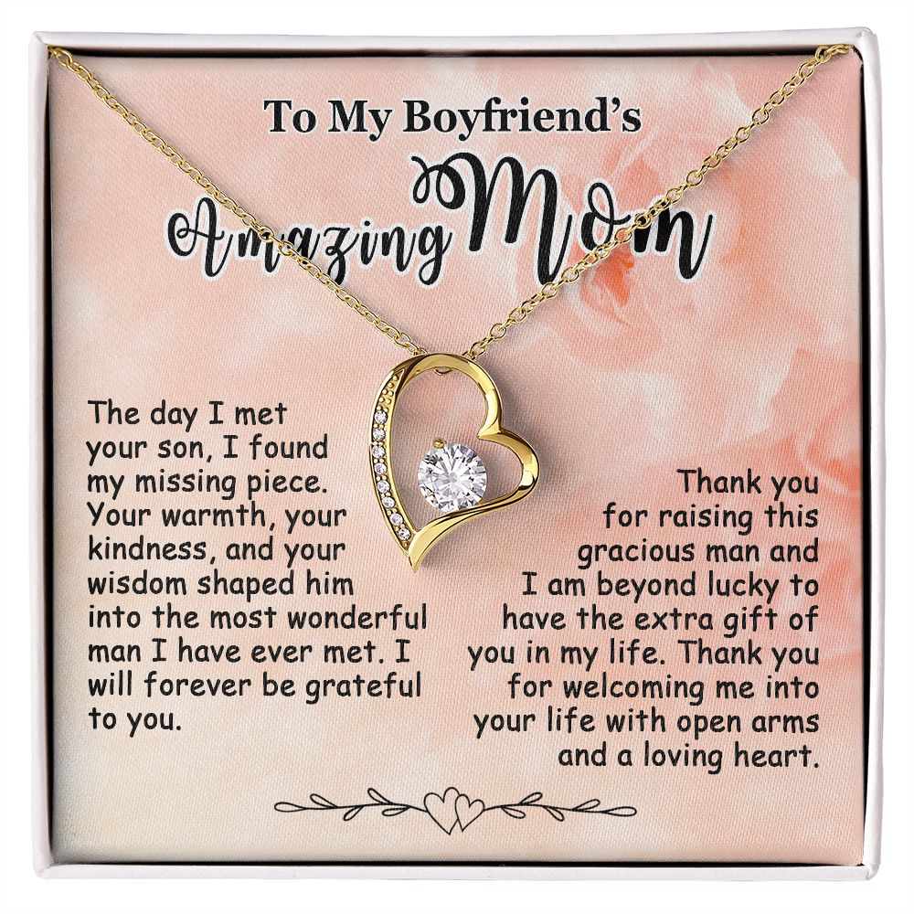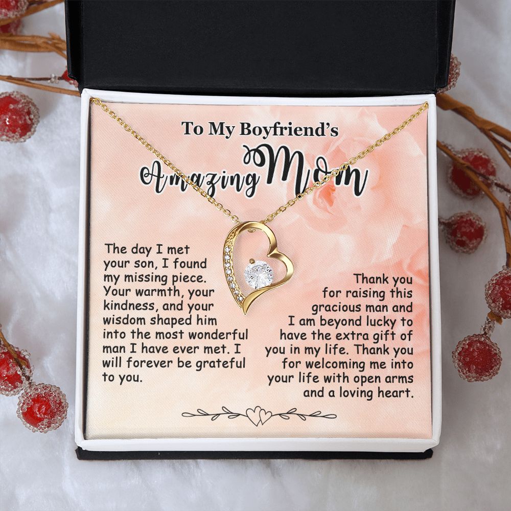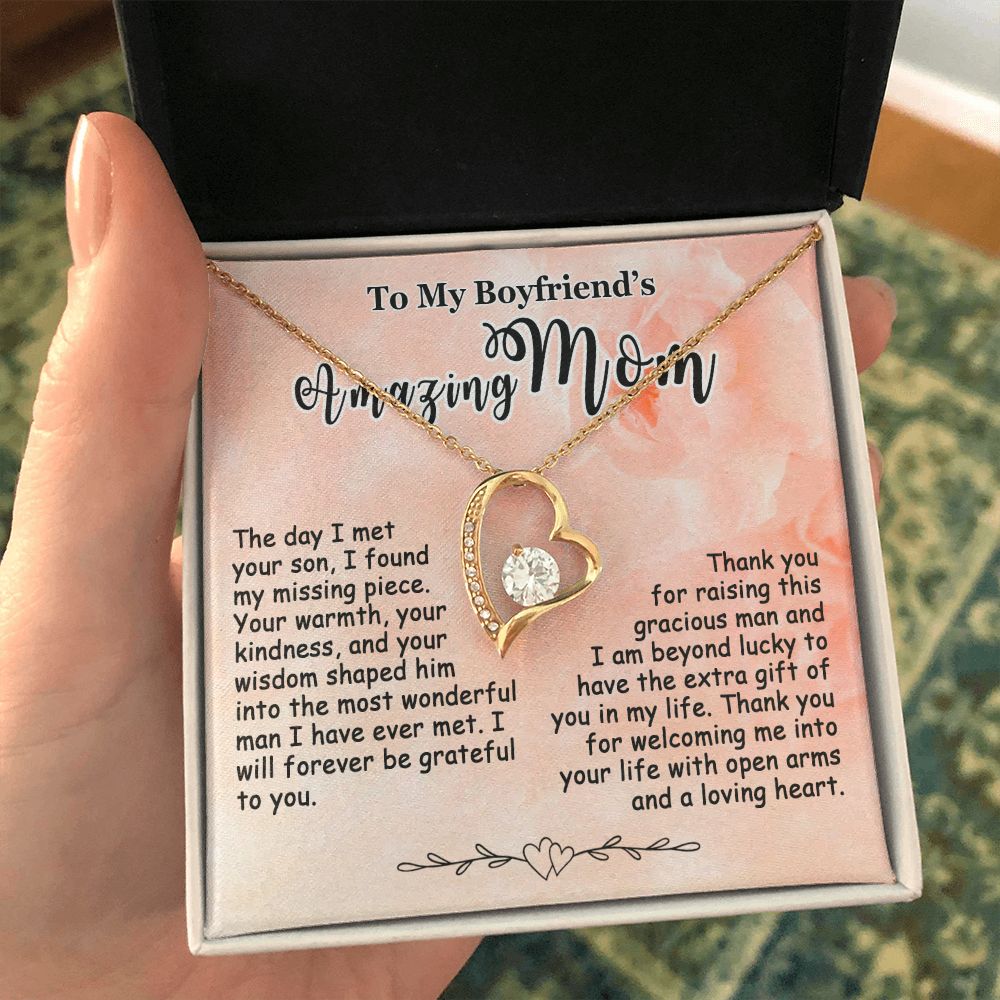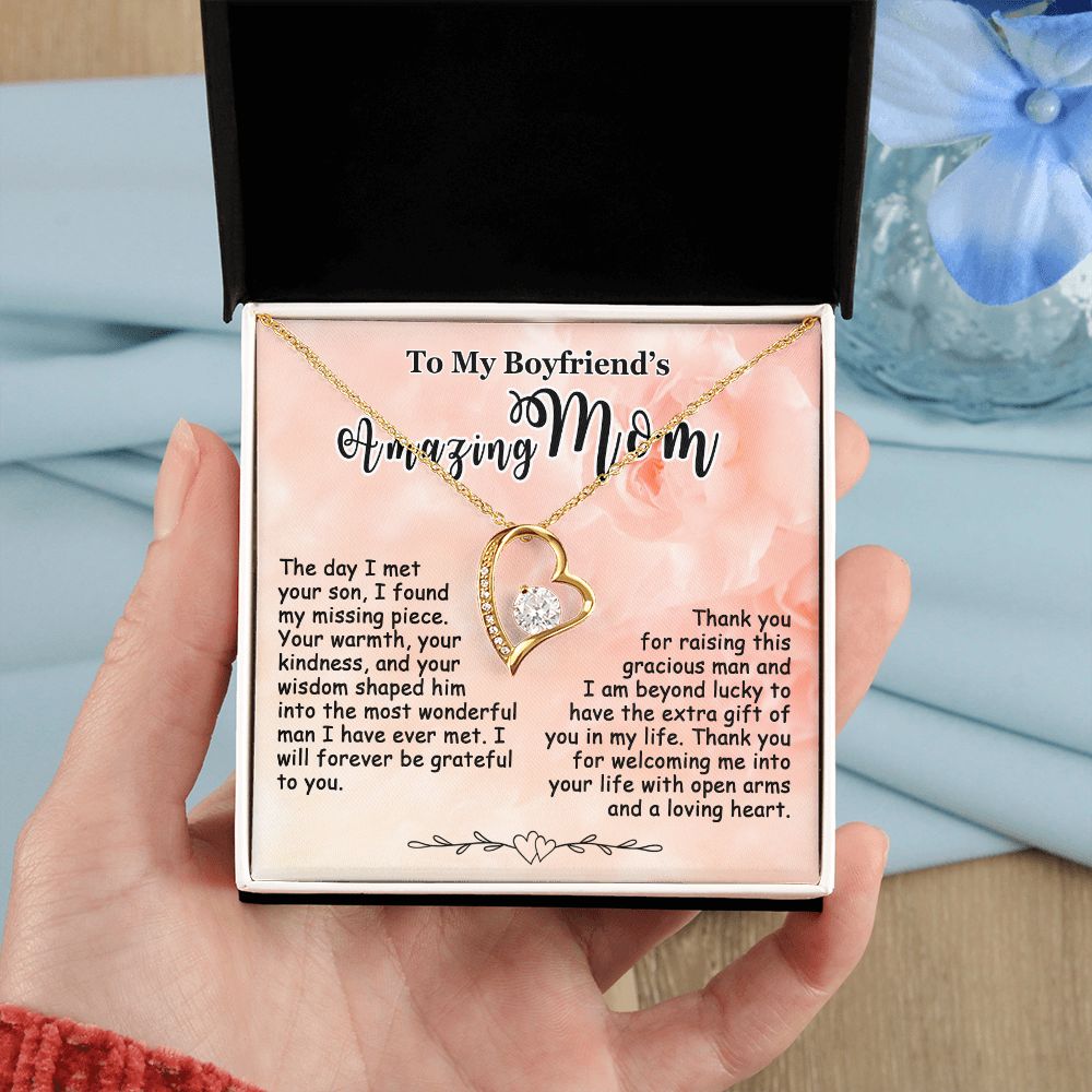 Showing your appreciation to your boyfriend’s mom just got easier. Our To My Boyfriend’s Mom Necklace makes an ideal Mother’s Day or birthday present. Thoughtfully crafted and paired with a meaningful message card, this necklace will become a treasured memento close to her heart. Show your love to your boyfriend’s mom today.