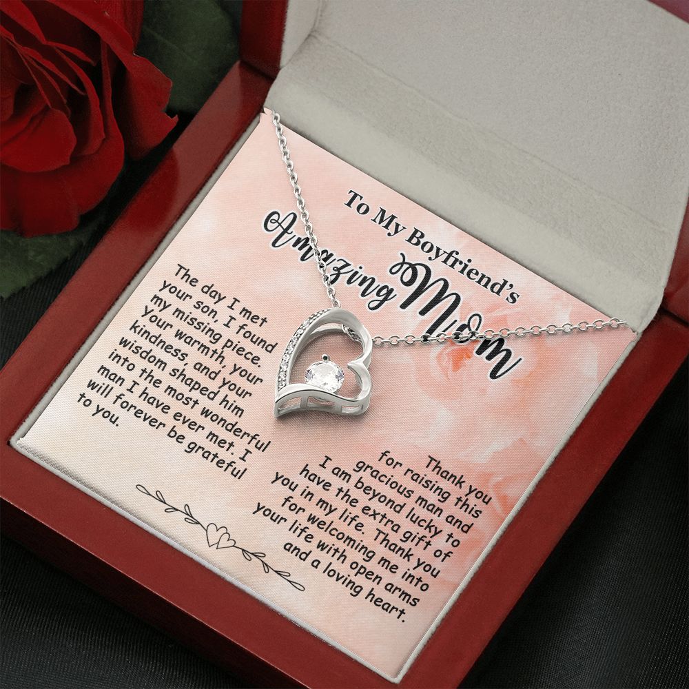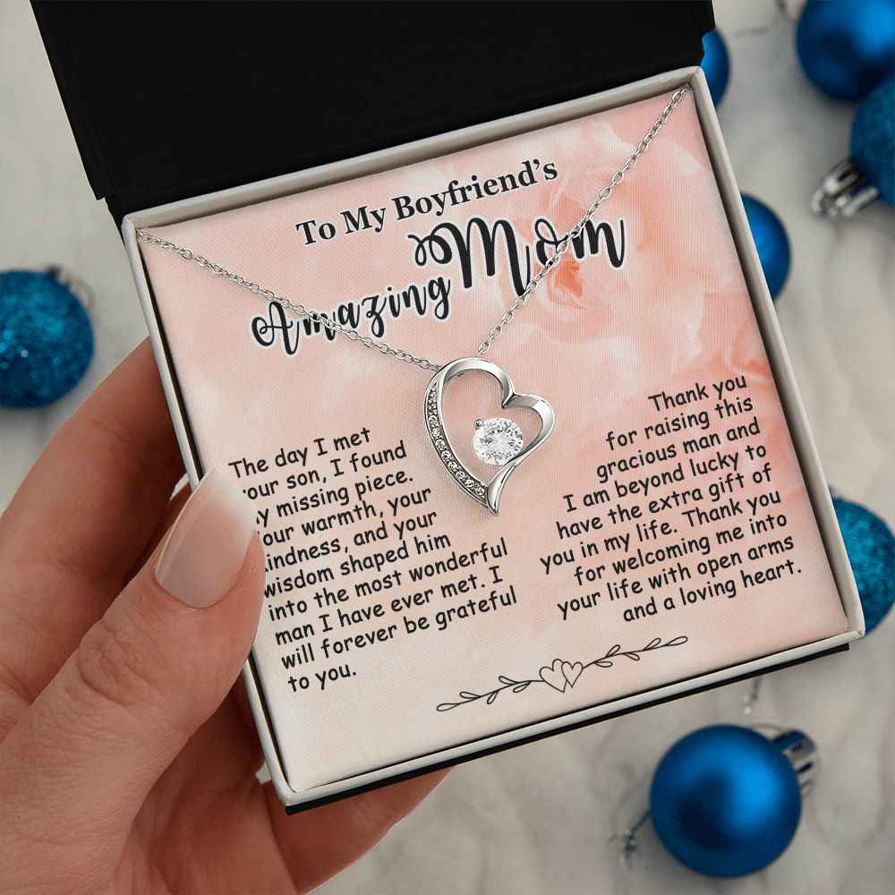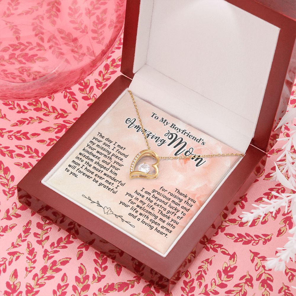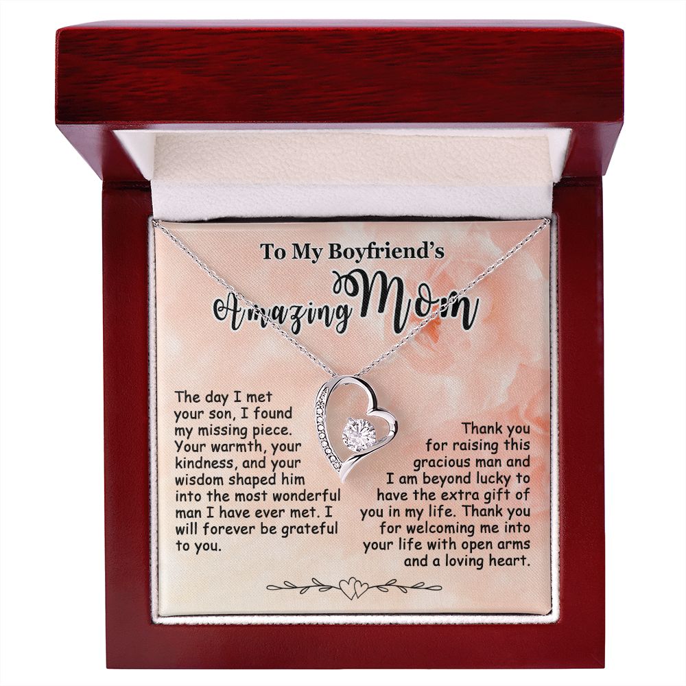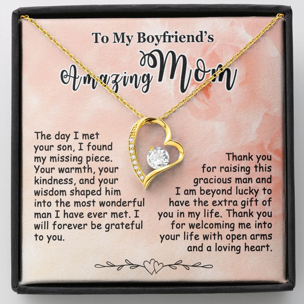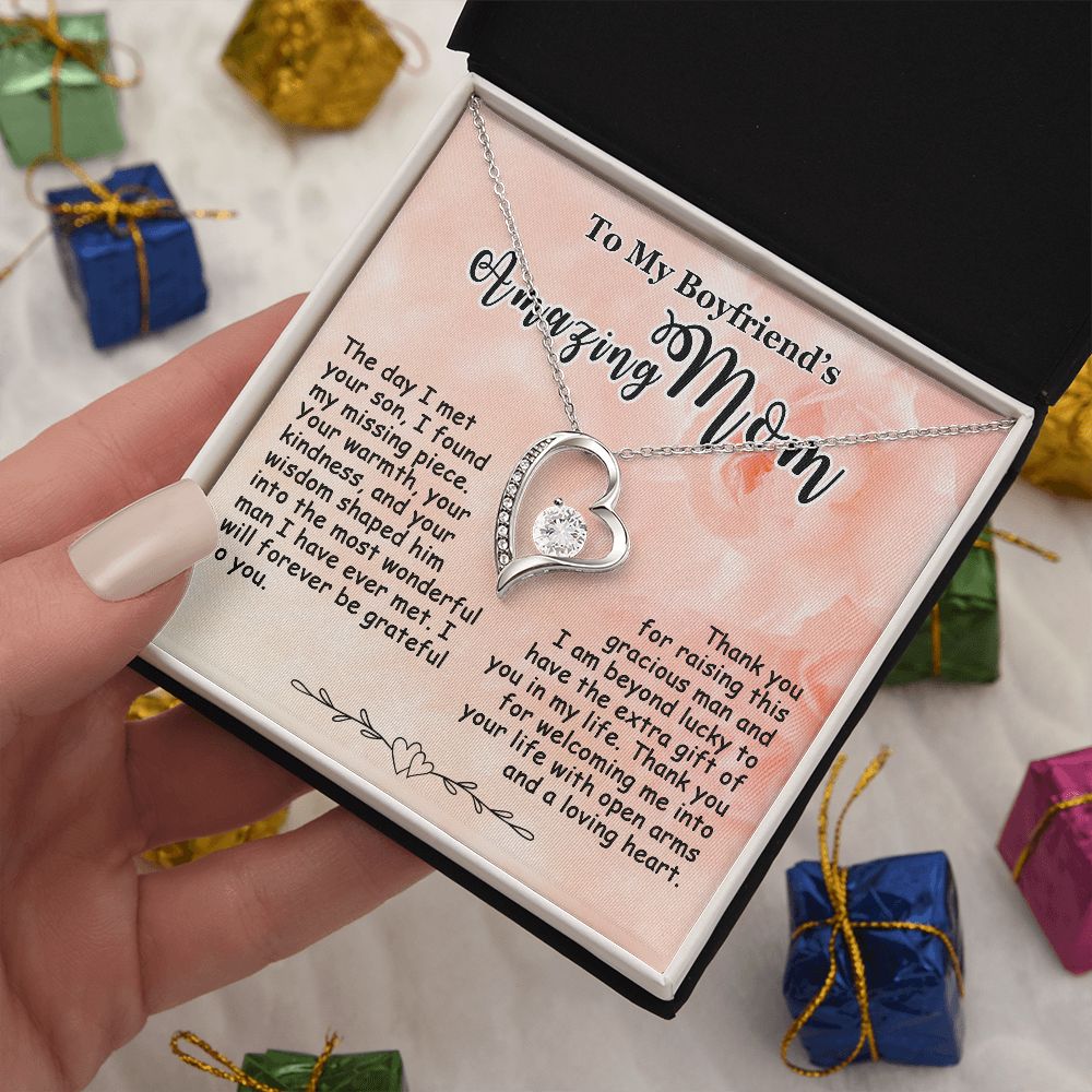 Showing your appreciation to your boyfriend’s mom just got easier. Our To My Boyfriend’s Mom Necklace makes an ideal Mother’s Day or birthday present. Thoughtfully crafted and paired with a meaningful message card, this necklace will become a treasured memento close to her heart. Show your love to your boyfriend’s mom today.