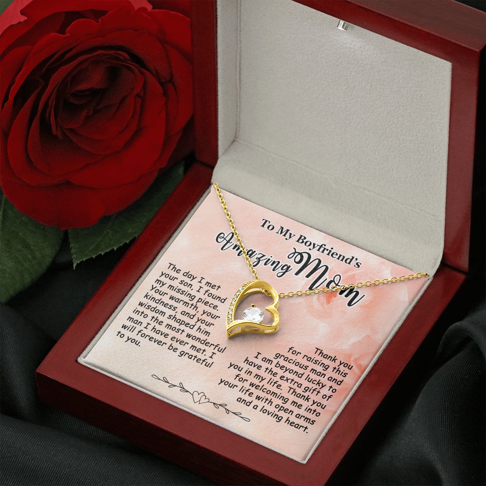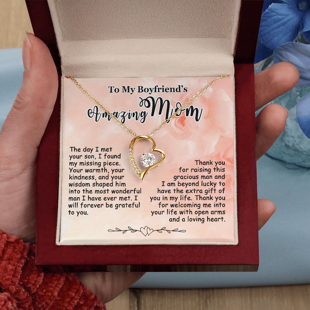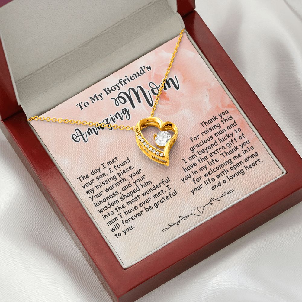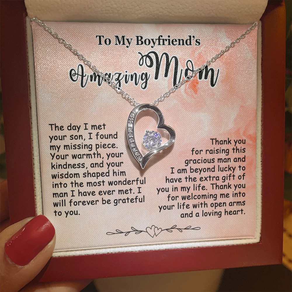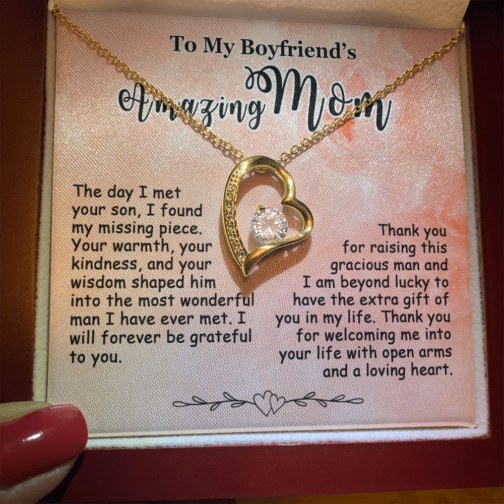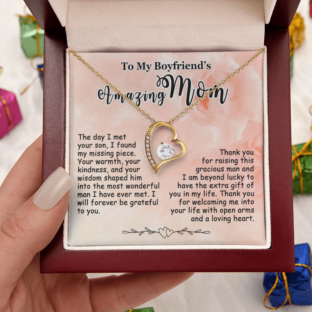 Showing your appreciation to your boyfriend’s mom just got easier. Our To My Boyfriend’s Mom Necklace makes an ideal Mother’s Day or birthday present. Thoughtfully crafted and paired with a meaningful message card, this necklace will become a treasured memento close to her heart. Show your love to your boyfriend’s mom today.