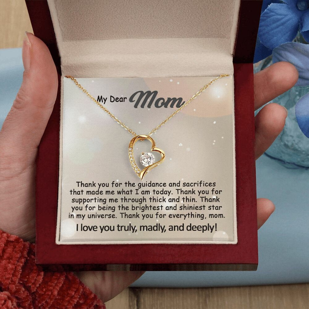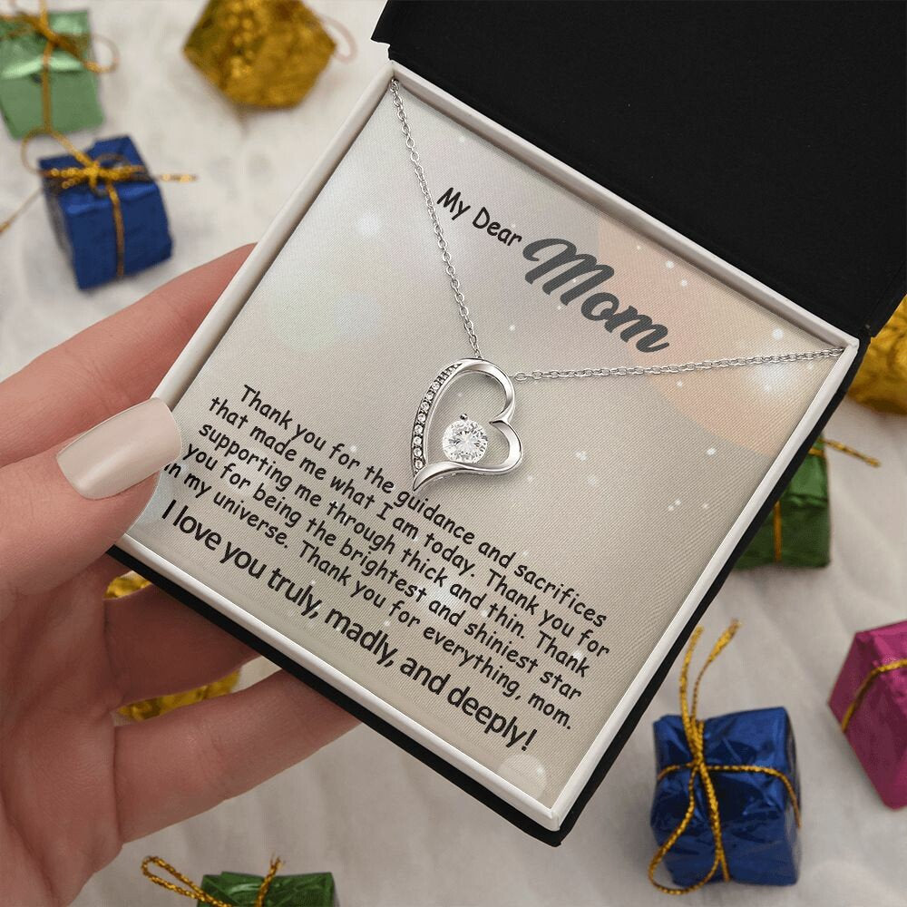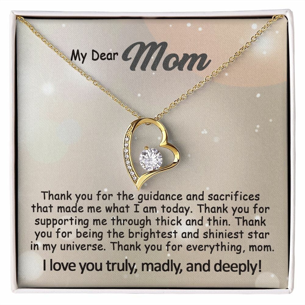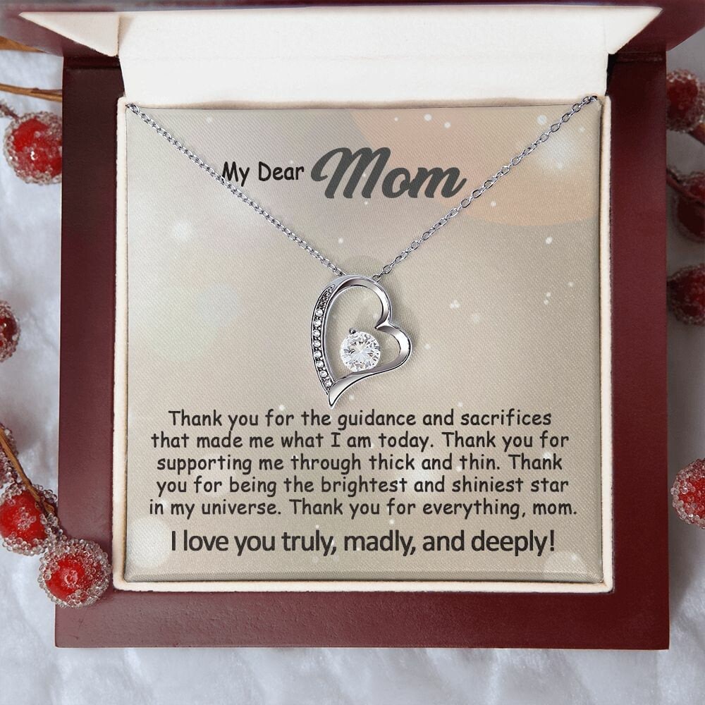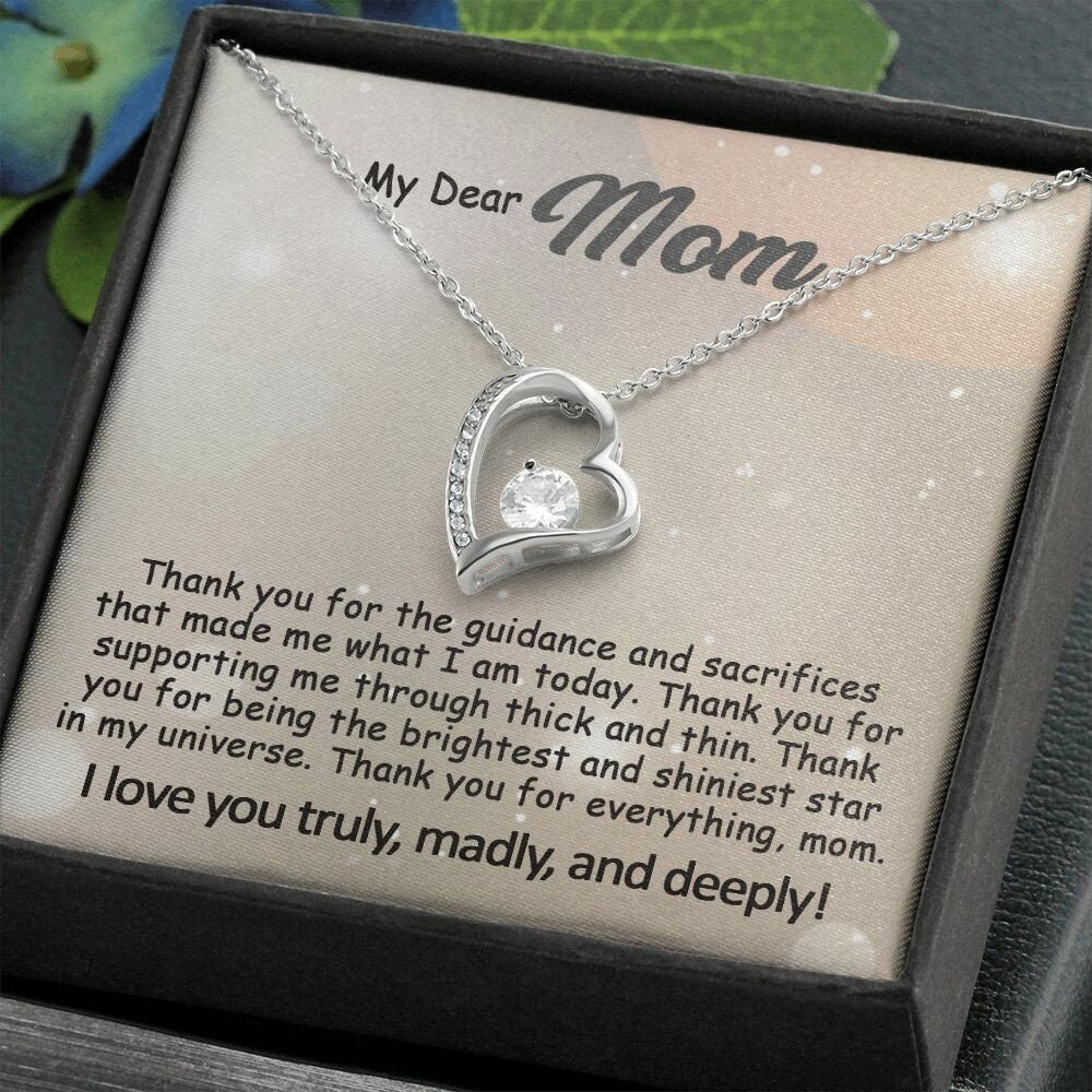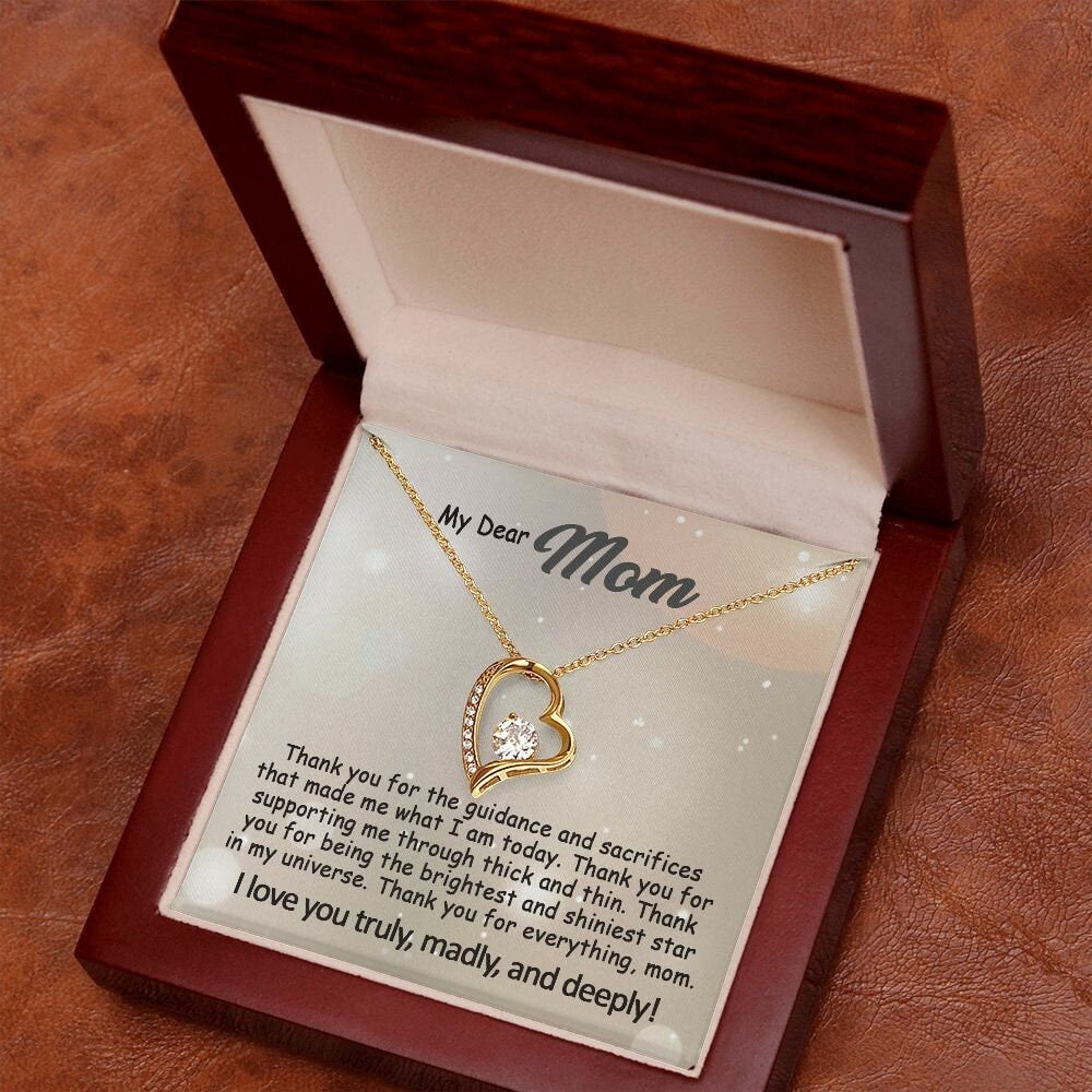 The Best Mom Gift: To My Mom Necklace, Mothers Day Birthday Gift Ideas From Daughter & Son, Love Quote Message Card Forever Love Pendant Jewelry For Mother.Find more gifts for mom here: https://www.etsy.com/shop/GoodiesPro?section_id=38957776Visit our shop for more exquisite gifts: https://www.etsy.com/shop/GoodiesProPersonalized and Shipped from the USA• NOT SOLD IN STORE• USA: 3-5 Business Days• Unique, one-of-a-kind giftThis dazzling Forever Love necklace symbolizes your never-ending love for your mom.It features a stunning Cubic Zirconia crystal surrounded by a polished heart pendant, embellished with smaller crystals to add extra sparkle and shine. Beautifully crafted with either white gold or yellow gold finish. Whether it’s a birthday, wedding, Mother’s day gift or else, make sure to dazzle your special someone by gifting them this stunning necklace they can enjoy every day. Matched with a heartfelt message card.👉 OUR NECKLACE FEATURESThis necklace comes with a heartfelt written message card and is ready for gift-giving.• 14k white gold finish or 18k yellow gold finish over stainless steel• 6.5mm round cut Cubic Zirconia stone• Pendant dimensions: 0.8″ (2.2cm) height / 0.7″ (1.8cm) width• Adjustable length: 18″ – 22″ (45.72 cm – 55.88 cm)• Lobster clasp• Made in the USA👉 GIFT BOXYour piece is lovingly packaged in a complimentary soft touch box for easy gifting. Elevate your presentation by upgrading to the mahogany-style luxury box, which features a brilliant LED spotlight for a truly impressive display.👉 PROCESSING TIMEProcessing time usually is within 1 to 3 business days and ships fast via USPS First Class, provide a tracking number.- Order processing 1-3 business days- Made and shipped from the USA, 3-6 business days, with tracking number.- everywhere else: 5-20 business days👉 JEWELRY CARE• Polish gently using a polishing cloth• Remove jewelry before exercising or showering• Separate from other jewelry to prevent scratching• Avoid exposure to perfumes, lotions, and other chemicals👉 OUR PROMISEWe do everything to make your shopping with us a great experience. If you’re not 100% satisfied with your purchase for any reason, please contact us and we will make it right. Your satisfaction is our ultimate goal. 👉 RETURNSAs this jewelry is custom made-to-order, we cannot accept returns or exchanges unless they arrive damaged or defective. Please contact me if you have any problems, and I will do my best to fix them.😇Thanks for shopping at GoodiesPro and supporting our small family-run business! We appreciate you very much!#e241
