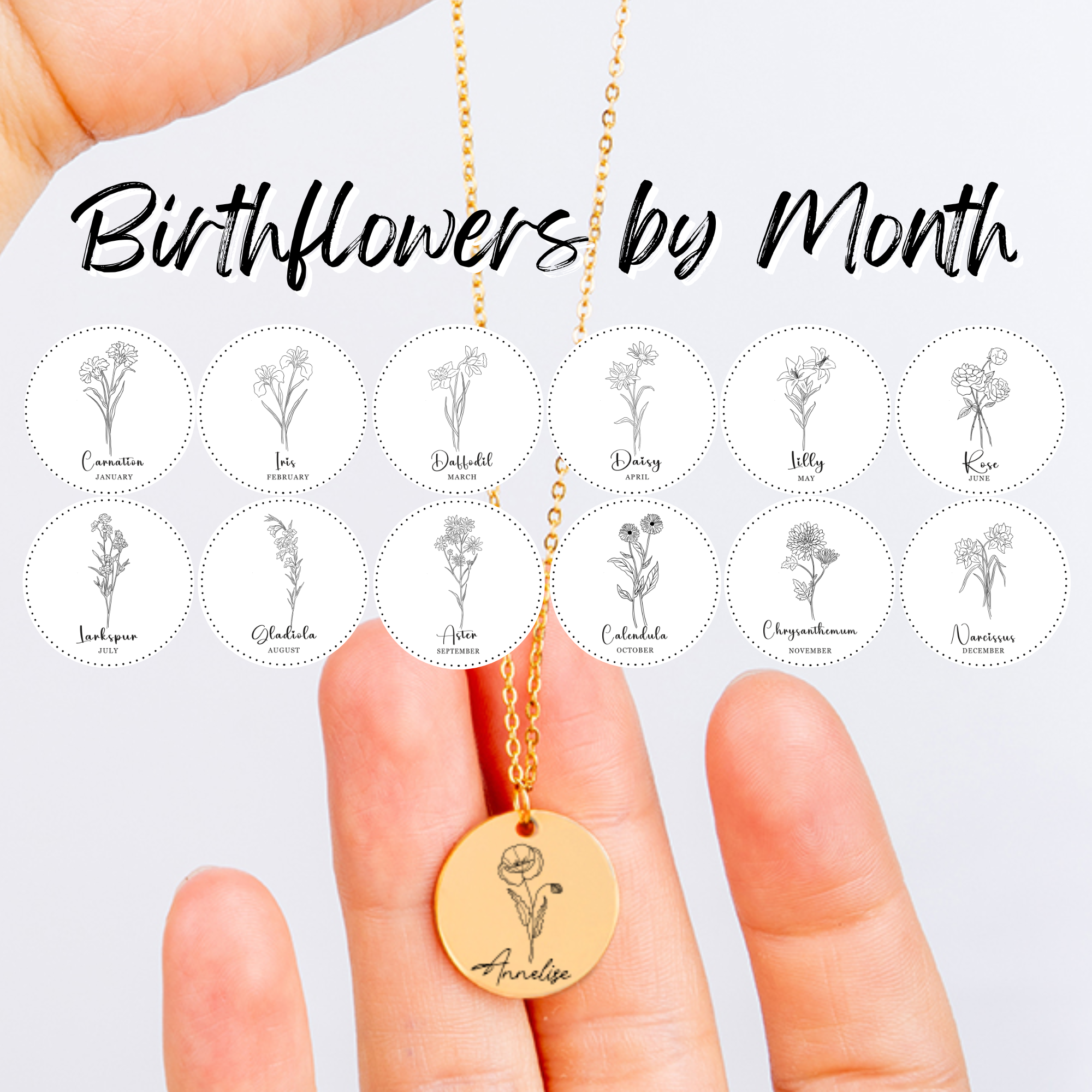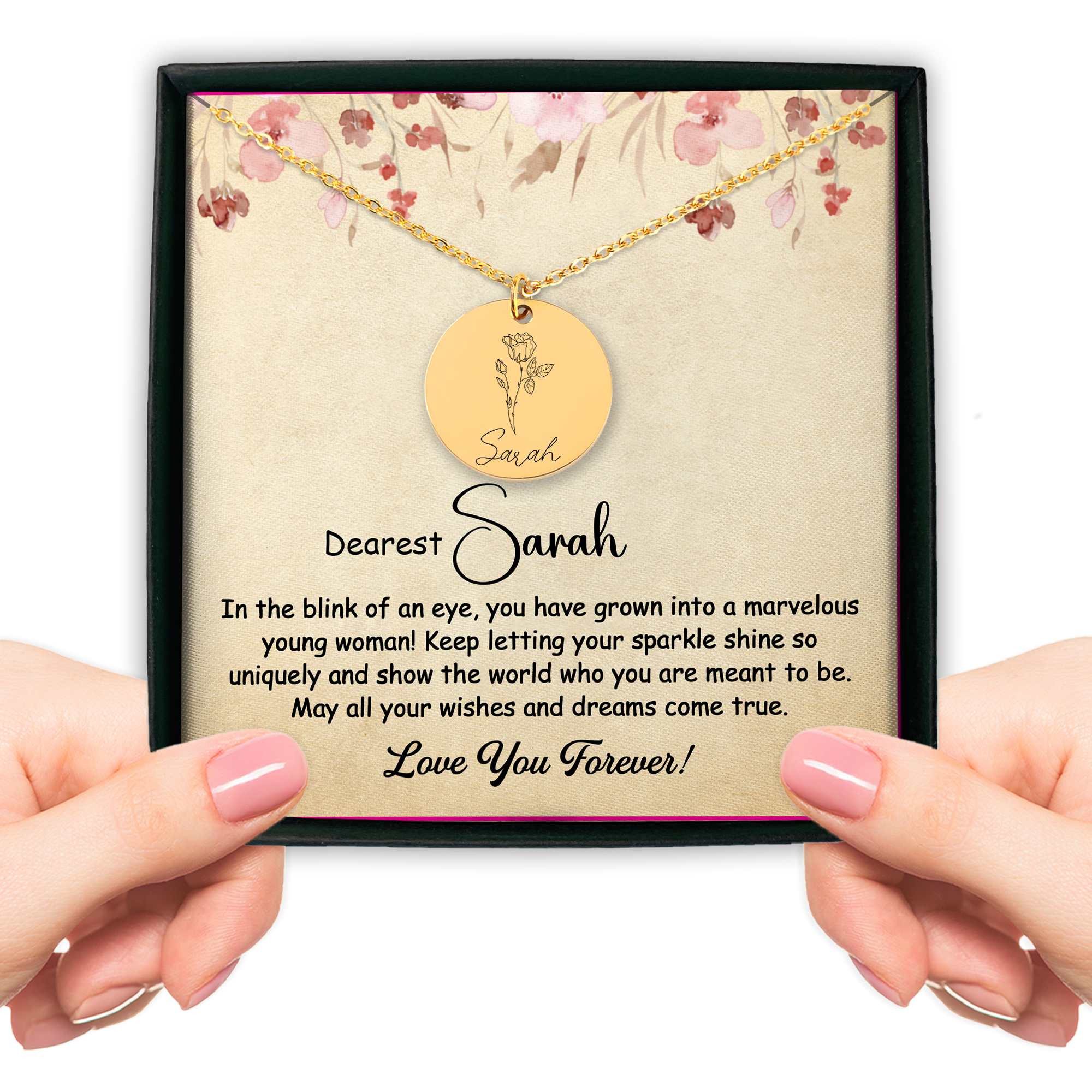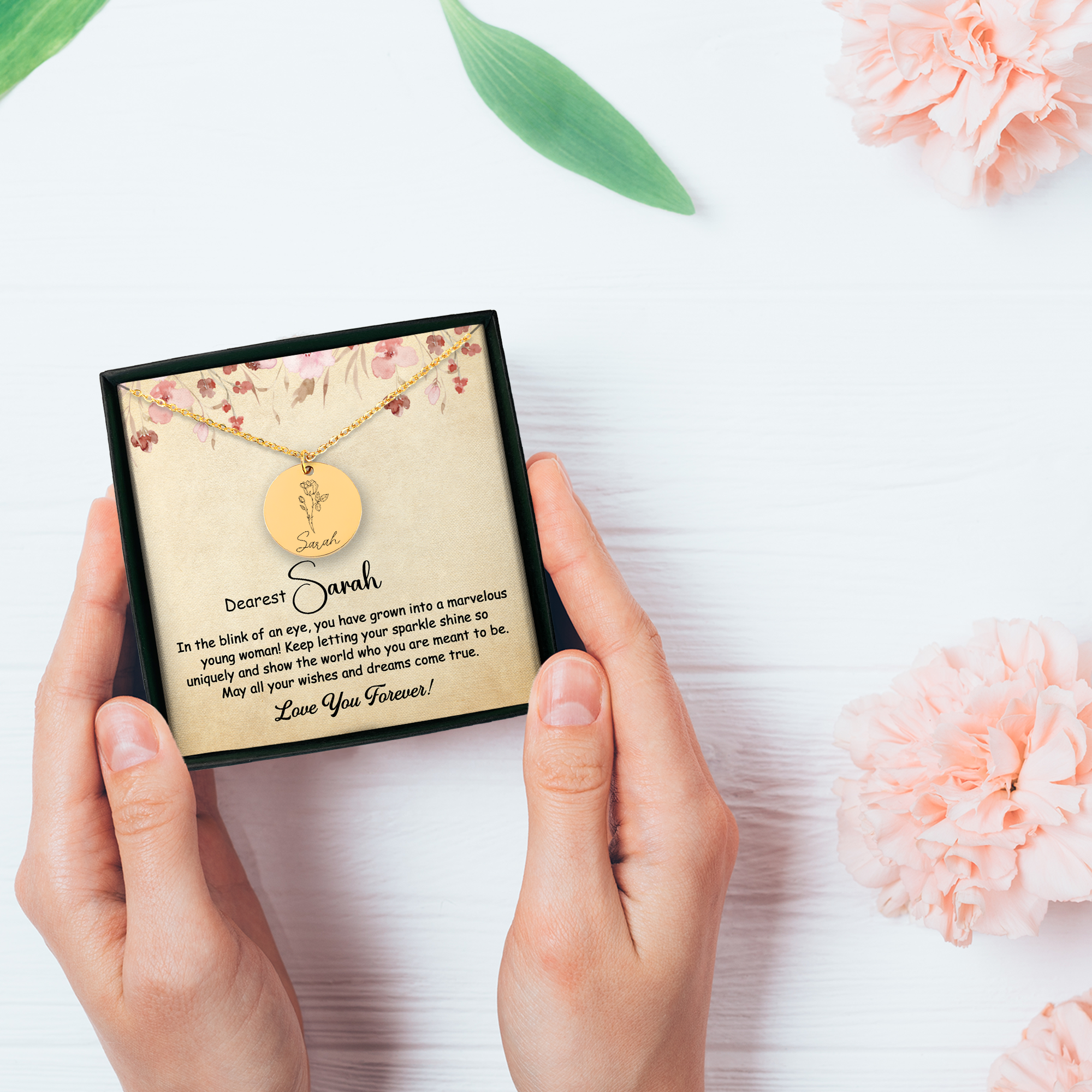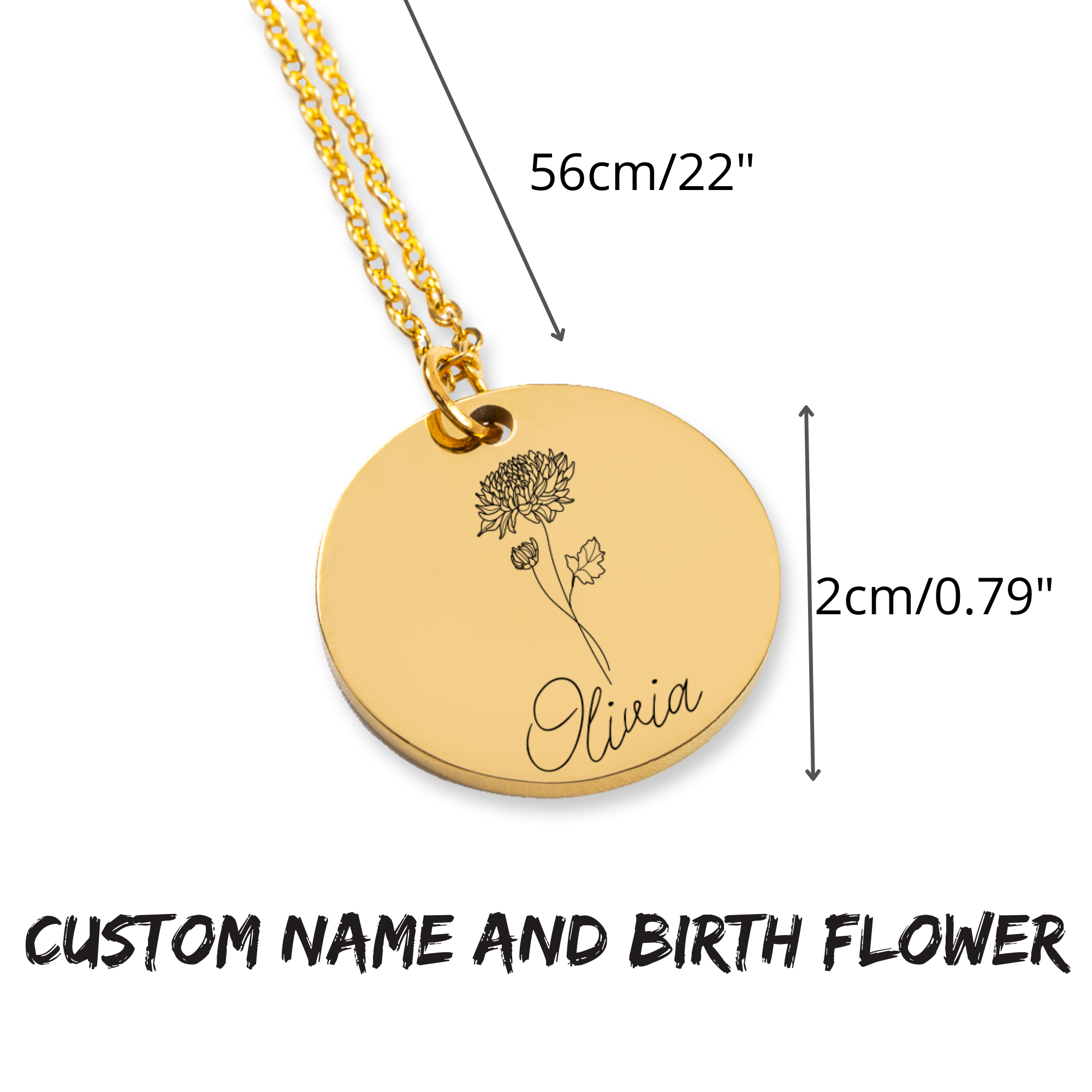 Create a truly unique gift by personalizing this necklace with a name and a birth flower. Optionally, you can choose to give the necklace an even more personal touch by adding a custom message or coordinates on the back.