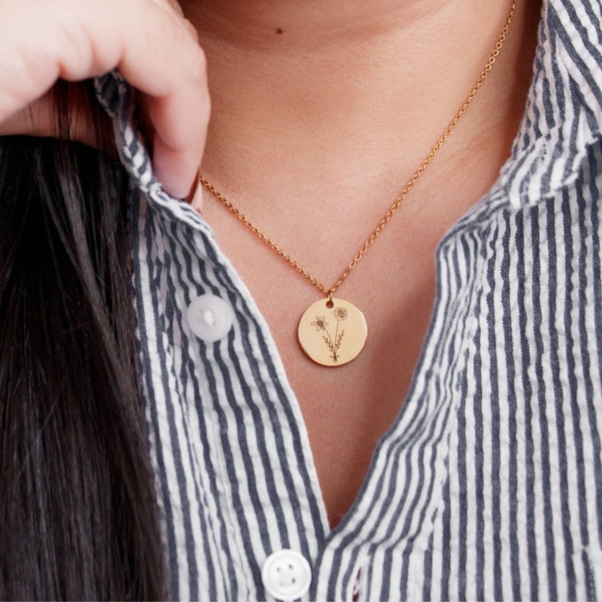 Create a truly unique gift by personalizing this necklace with a name and a birth flower. Optionally, you can choose to give the necklace an even more personal touch by adding a custom message or coordinates on the back.