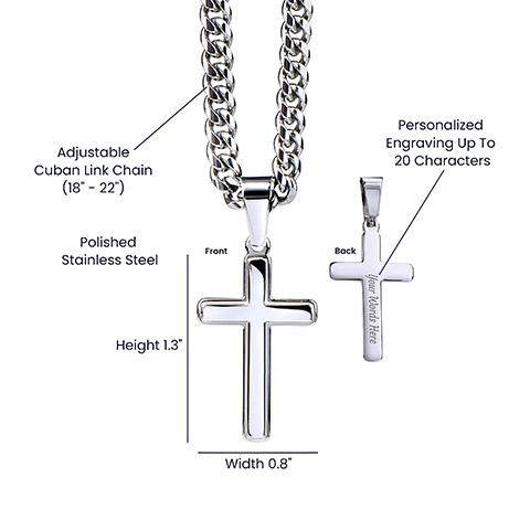 Sizing is appropriate for all ages, and tasteful for both men and women. Crafted in high polished stainless steel, this piece will resist tarnishing and is hypoallergenic for sensitive skin. Personalize a message on the back of the cross pendant up to 20 characters. Includes an adjustable cuban link chain (18″ – 22″).