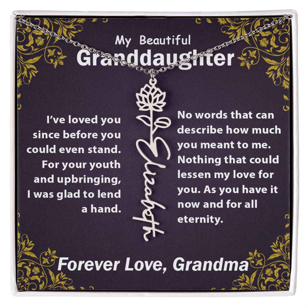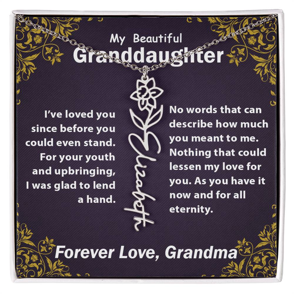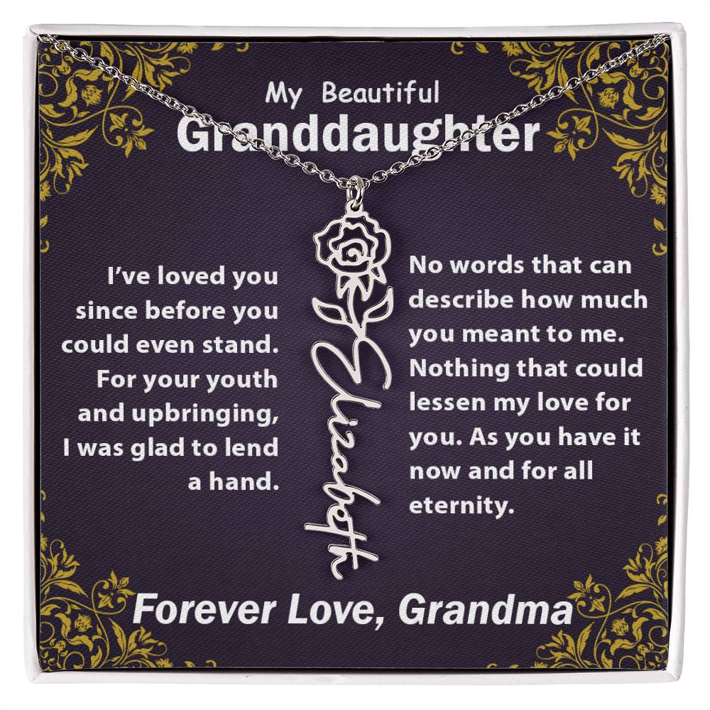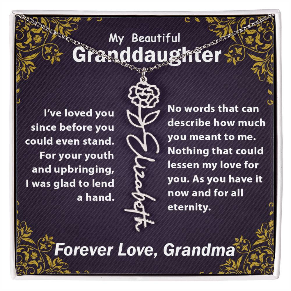 This stylish necklace features a cursive name design suspended on an 16”-18” adjustable cable chain, making it both personal and beautiful! Your necklace will be custom made upon ordering in the name or word of your choice, with up to 10 characters, and with the birth flower of your choosing. It’s a gift that they will surely want to keep close to their heart forever!