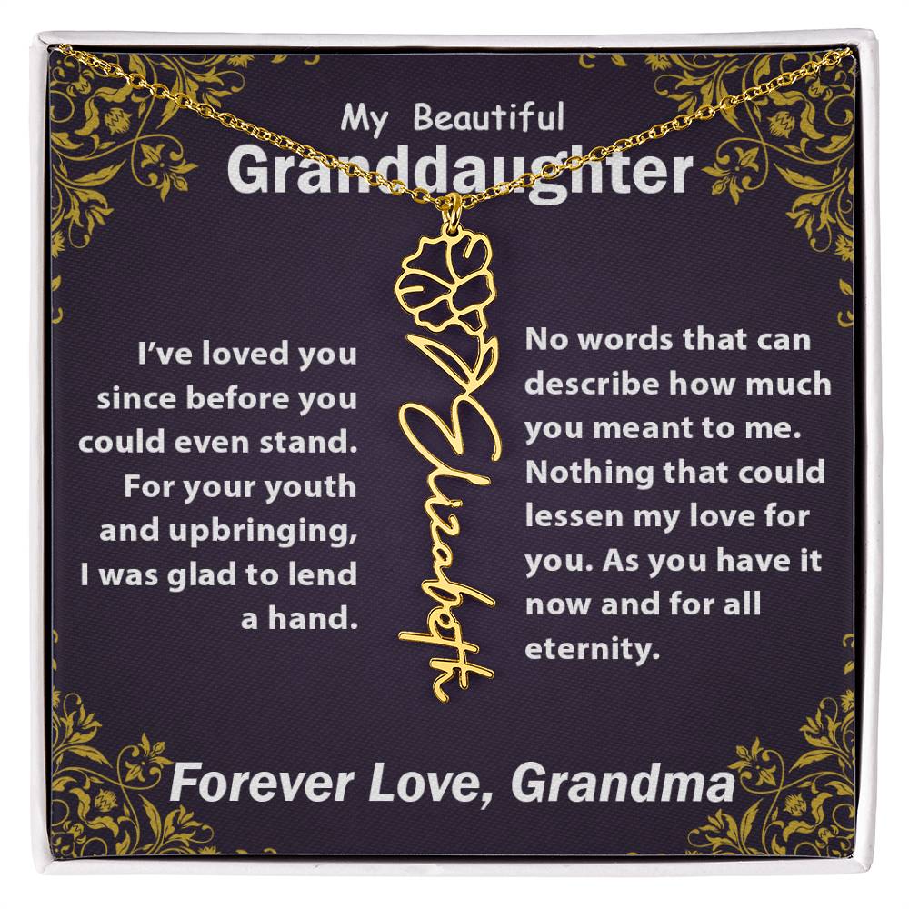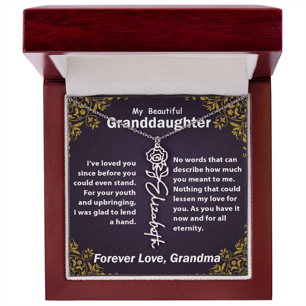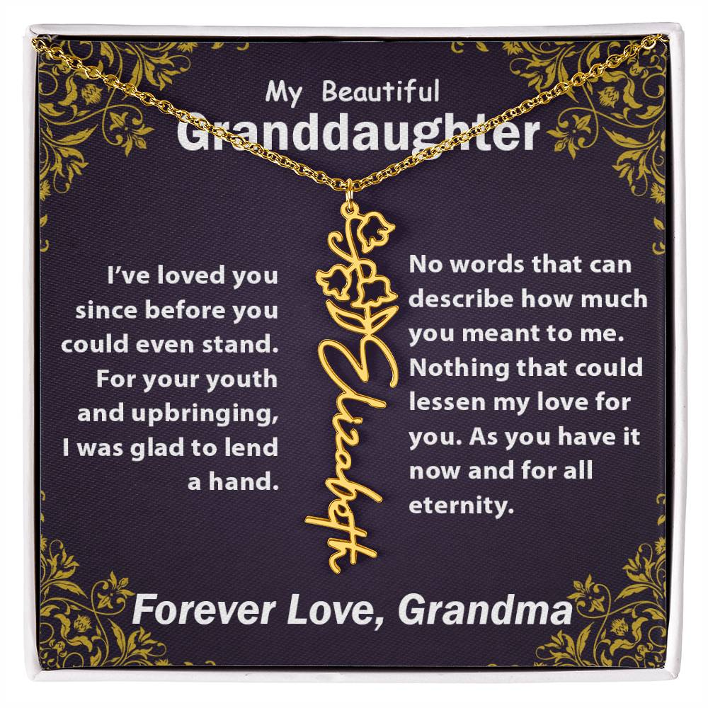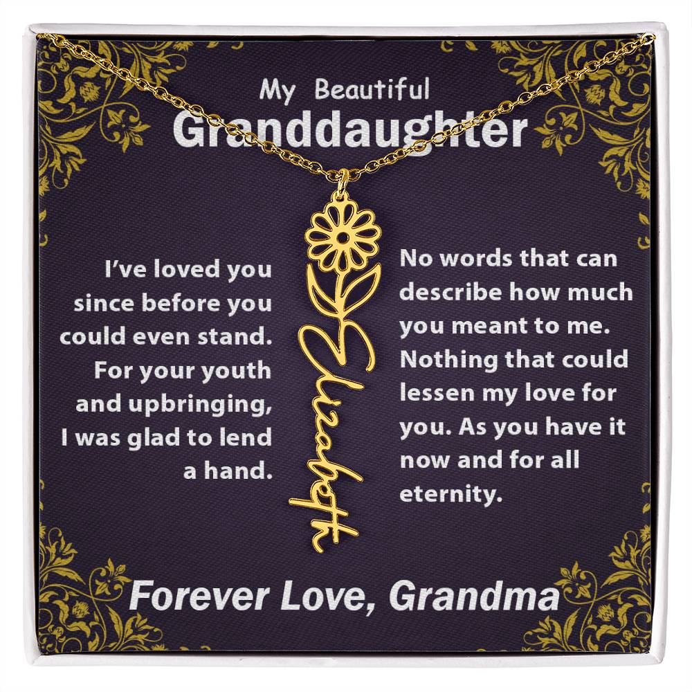 This stylish necklace features a cursive name design suspended on an 16”-18” adjustable cable chain, making it both personal and beautiful! Your necklace will be custom made upon ordering in the name or word of your choice, with up to 10 characters, and with the birth flower of your choosing. It’s a gift that they will surely want to keep close to their heart forever!