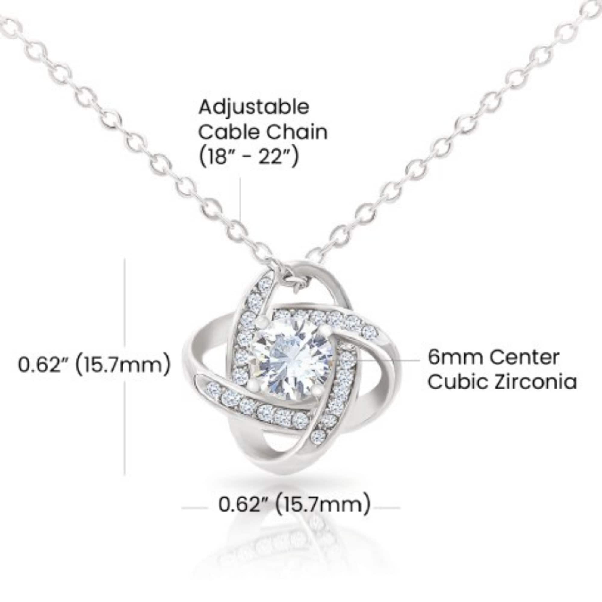 Imagine her reaction to receiving this beautiful Love Knot Necklace – representing an unbreakable bond between two souls. This jewelry features a beautifully woven pendant embellished with premium Cubic Zirconia stones. Choose between either a luxurious 14K white gold finish or a timeless 18K yellow gold finish to complete the look.